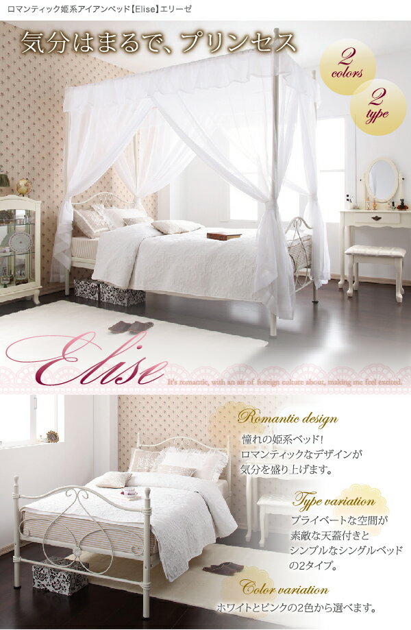 ロマンティック姫系アイアンベッド Elise エリーゼ ボンネルコイルマットレス付き 天蓋付き シングル【代引き不可】